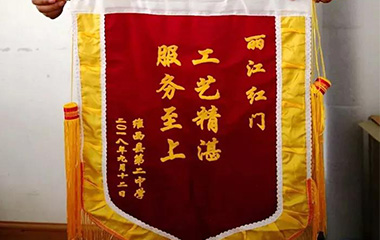 2018年9月12日,丽江红门段英祺总经理收到一面锦旗,上面绣着“ 工艺专业 服务至上 ”字样,可见维西县第二中学对丽江红门的感谢也巧妙地浓缩在字里行间,用真挚的话语表达了感激之情。 锦旗是荣誉更是激励, 每一面锦旗的背后, 都有着一份坚持与奉献。