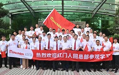 (余家红董事长、何菲总裁带领总部全体成员欢迎各地红门人的到来)